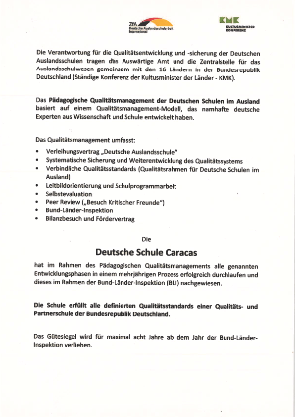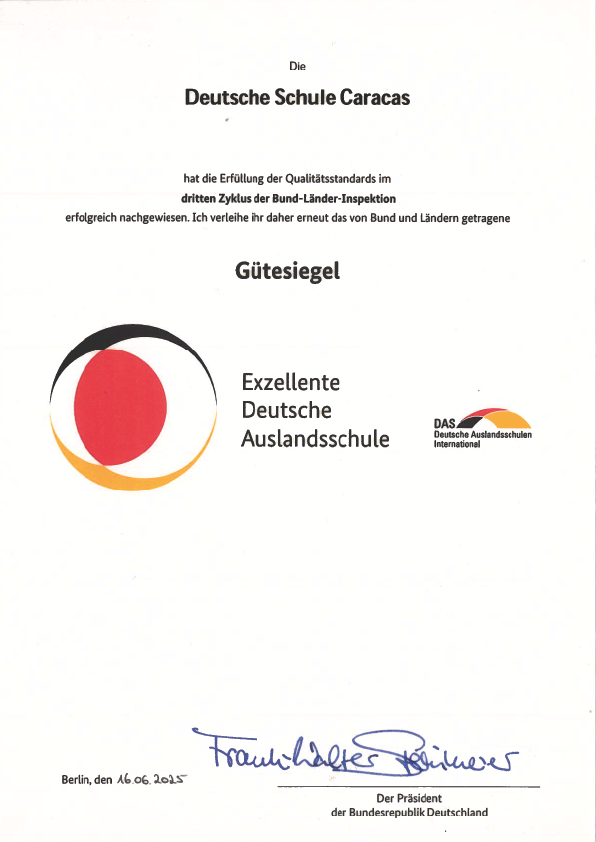 “Exzellente Deutsche Auslandsschule” es una distinción que se otorga a las escuelas alemanas en el extranjero que demuestran una calidad excepcional en materia de educación y desarrollo escolar. Estas escuelas reciben el Sello de Calidad luego de cumplir con los requisitos en la Inspección Federal-estatal (BLI), que evalúa su rendimiento y su perfil escolar en función de criterios de calidad. Esta certificación es ratificada por el Presidente de la República Federal de Alemania y resalta la gran reputación de las escuelas alemanas en el extranjero como espacios de educación y encuentro intercultural.